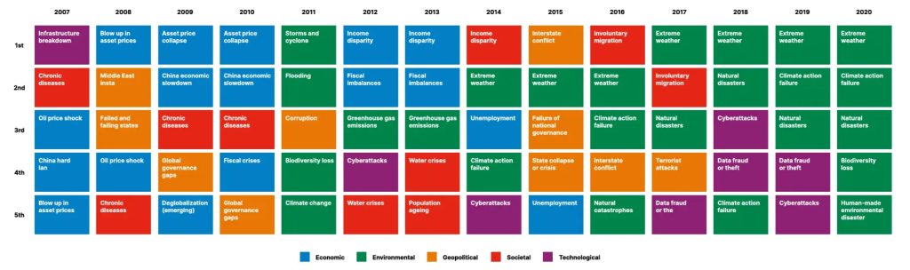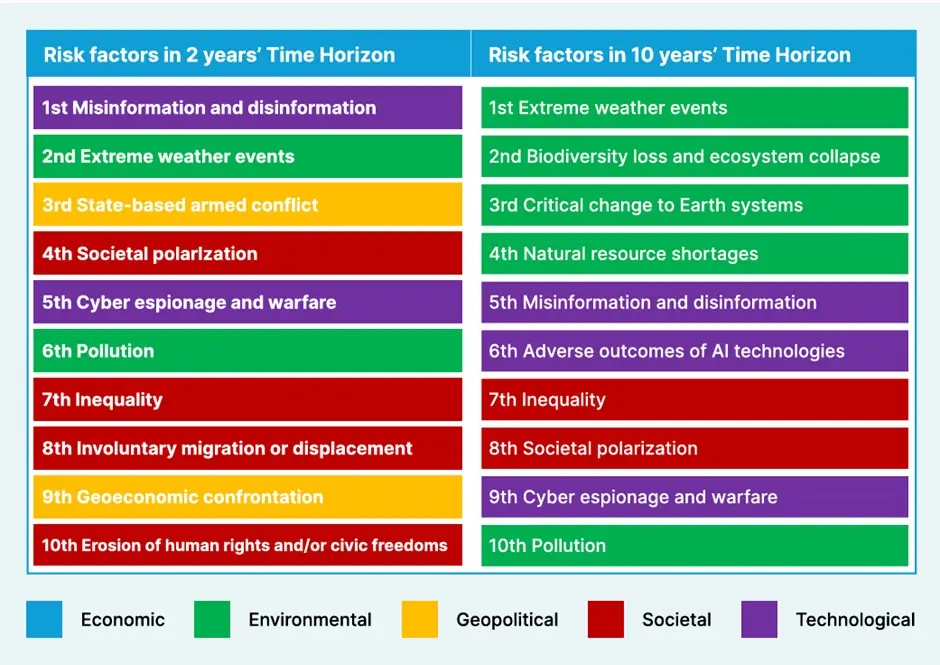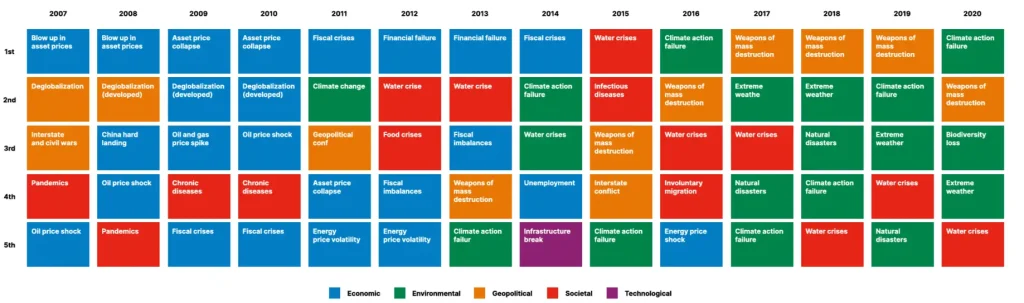 This fact is also evident in the World Economic Forum’s Annual Global Risk Reports. Every year, the World Economic Forum presents the risk perceptions of global leaders and experts on geopolitical, environmental, societal, and technological challenges across the short-, medium-, and long-term horizons.
