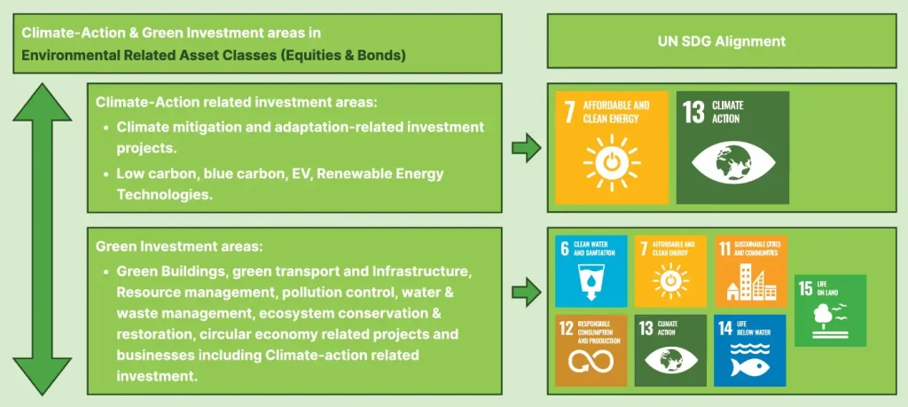 In recent years, the sustainable investment market has experienced noticeable growth, leading to a range of new sustainable financial products, including sustainable equity funds, sustainable index funds, sustainable bonds, green bonds, climate action bonds, social bonds, and sustainable loans. Figure 1 depicts the basic characteristics of these sustainable investment options.
