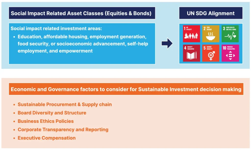 In addition to environmental and social factors, a sustainable investor also needs to consider other economic and governance factors: sustainable procurement and supply chain; board diversity and structure; business ethics policies; corporate transparency and reporting; and executive compensation.
